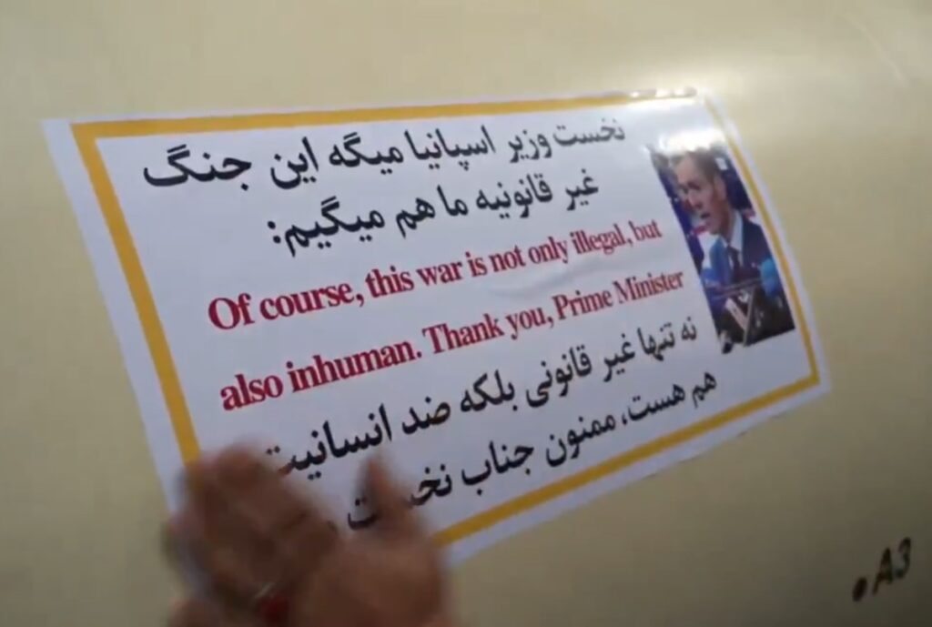 На наклейках також розміщений напис англійською та фарсі, що цитує антивоєнну промову Санчеса з недавнього саміту ЄС у Брюсселі: “Звичайно, ця війна не тільки незаконна, але й нелюдська”.