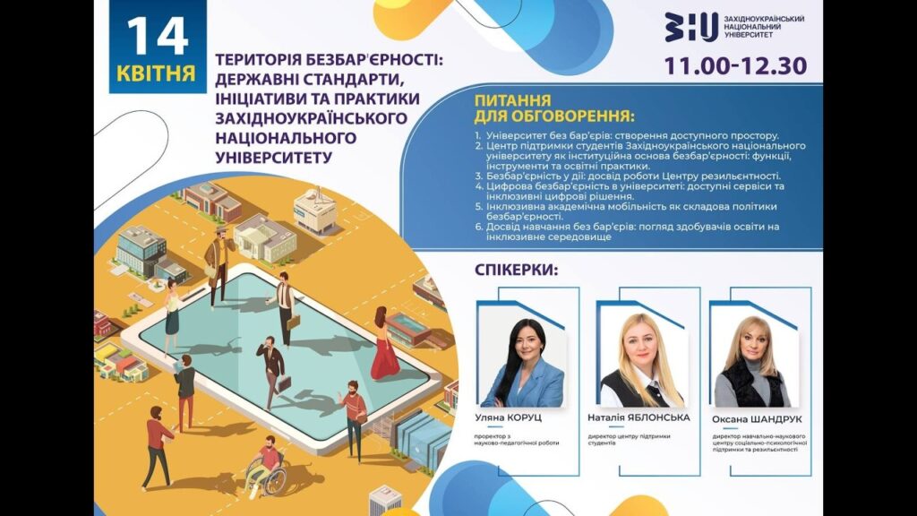 ПИТАННЯ ДЛЯ ОБГОВОРЕННЯ: 1. Університет без бар’єрів: створення доступного простору. 2. Центр підтримки студентів Західноукраїнського національного університету...